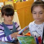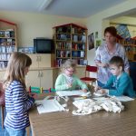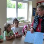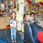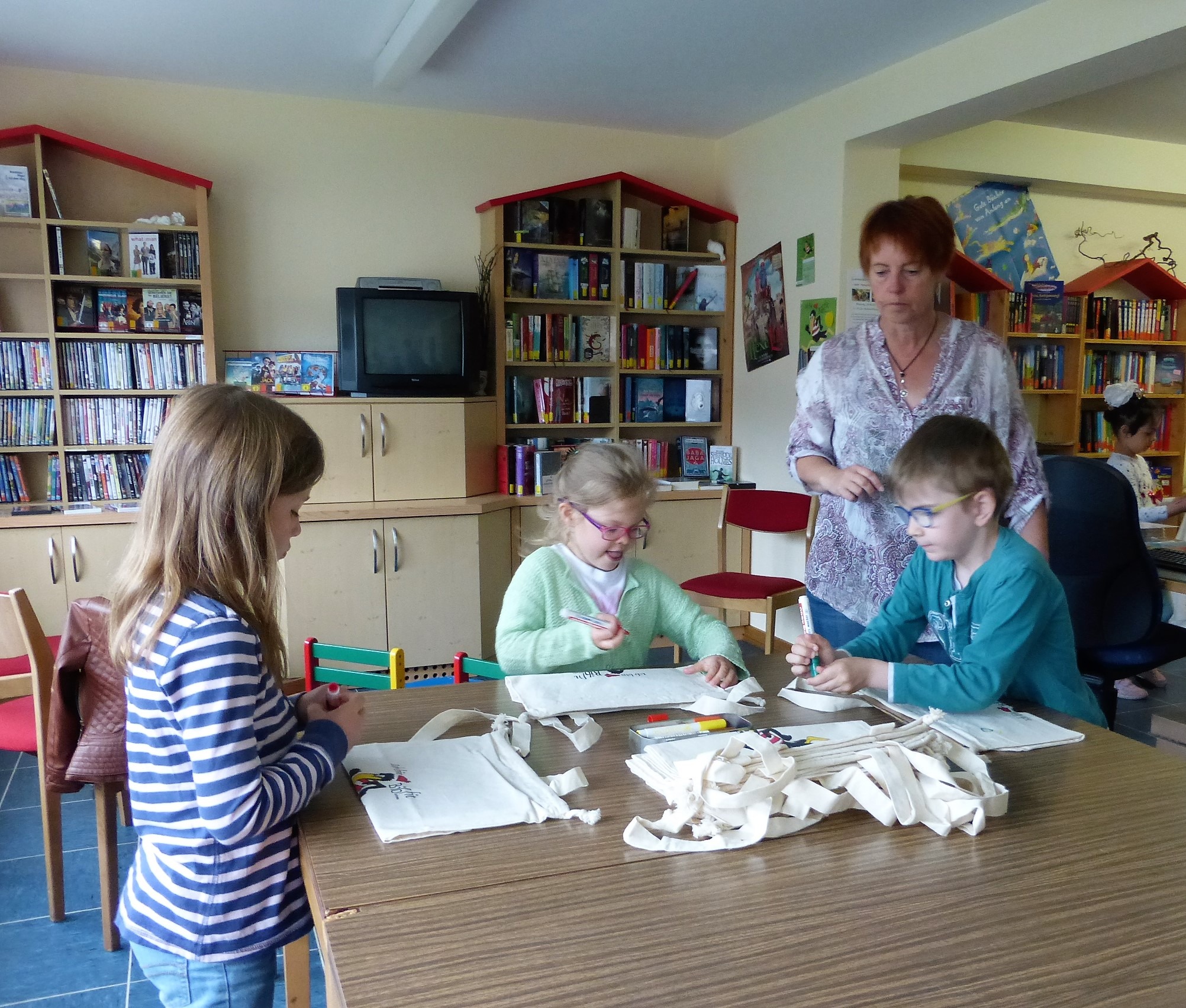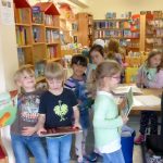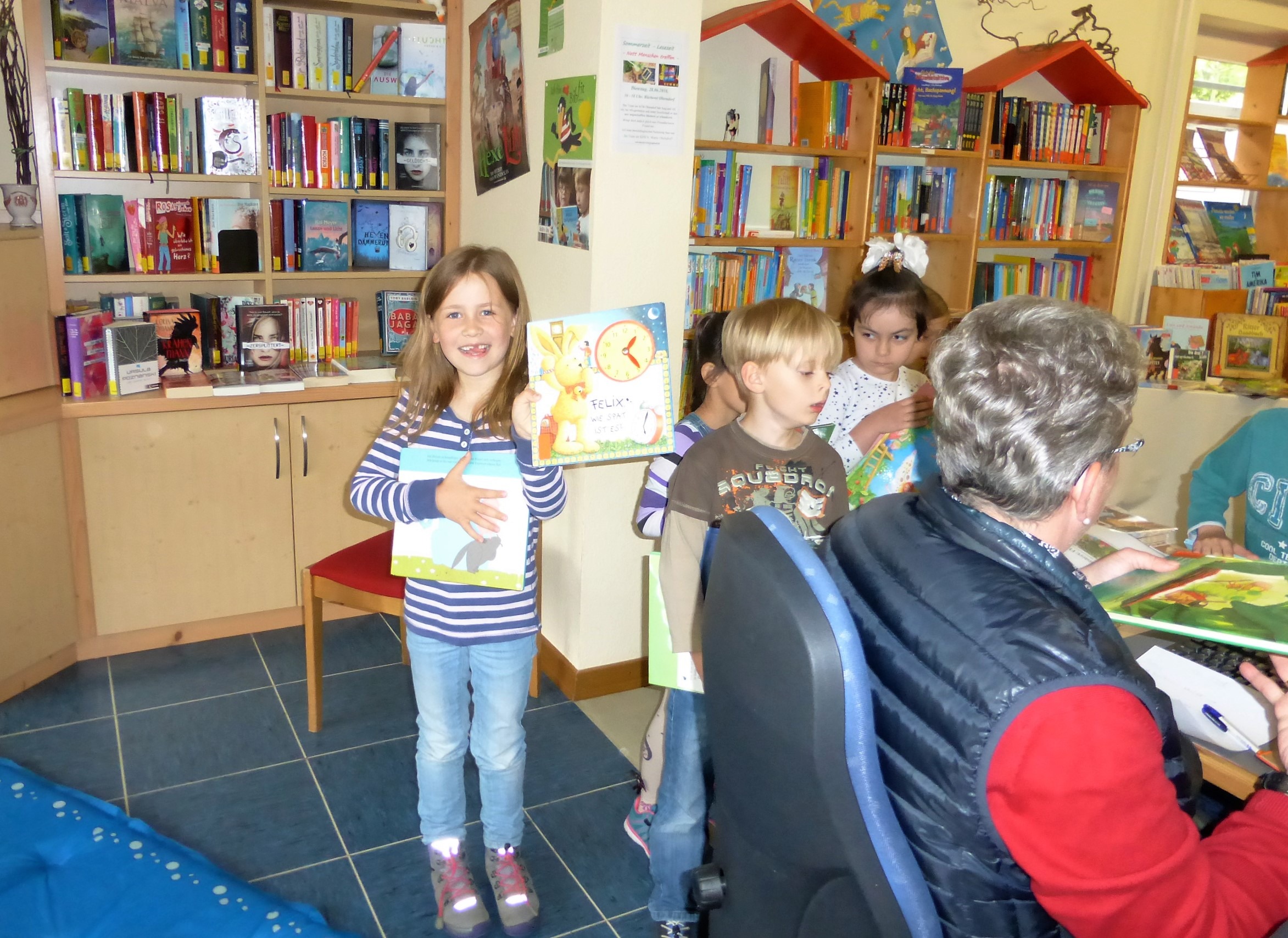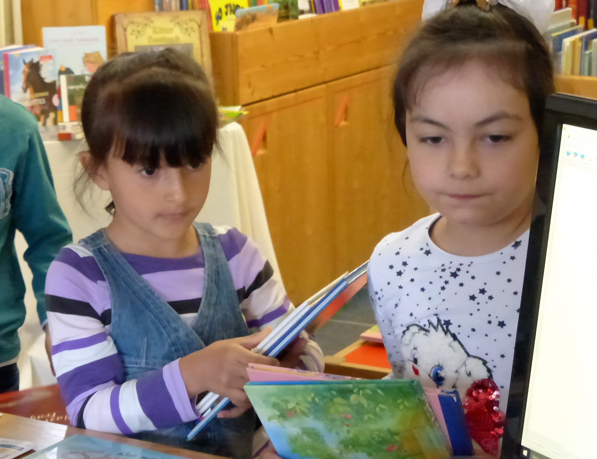 Natürlich erfuhren die Kinder auch was eine Bücherei ist, wo man seine Lieblingsbücher dort findet und wie man mit ausgeliehenen Büchern umgehen sollte. Danach erhielten sie eine Umhängetasche mit dem Bild des Bücherei-Maskottchen „Fridolin“ und konnten noch mit Stoffmalfarben ihren Namen drauf schreiben. So ausgerüstet erfuhren sie noch wie man Bücher ausleihen kann und machten davon auch gleich regen gebraucht.
