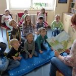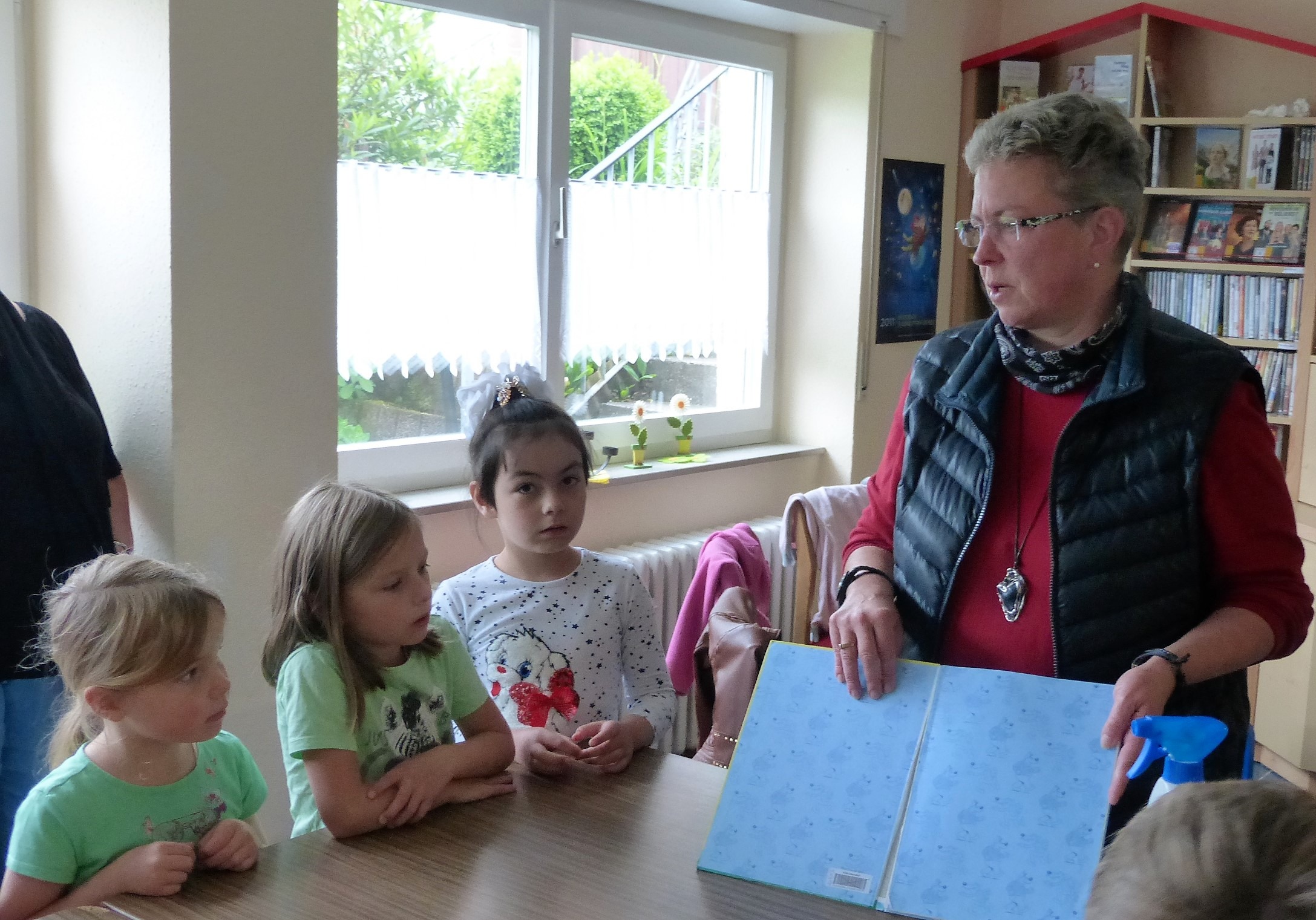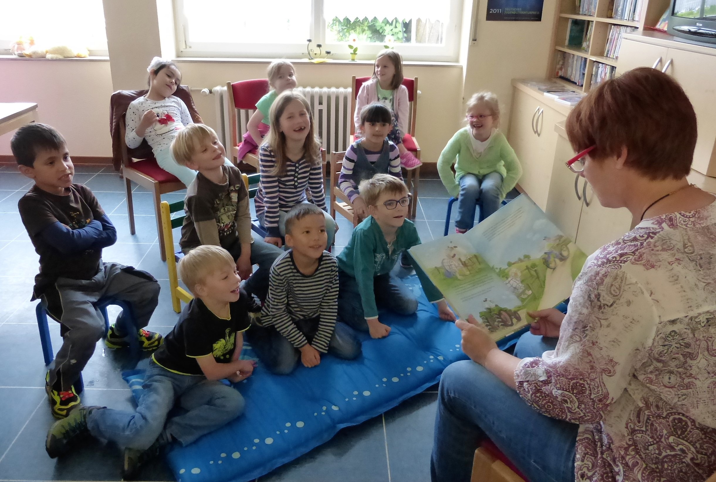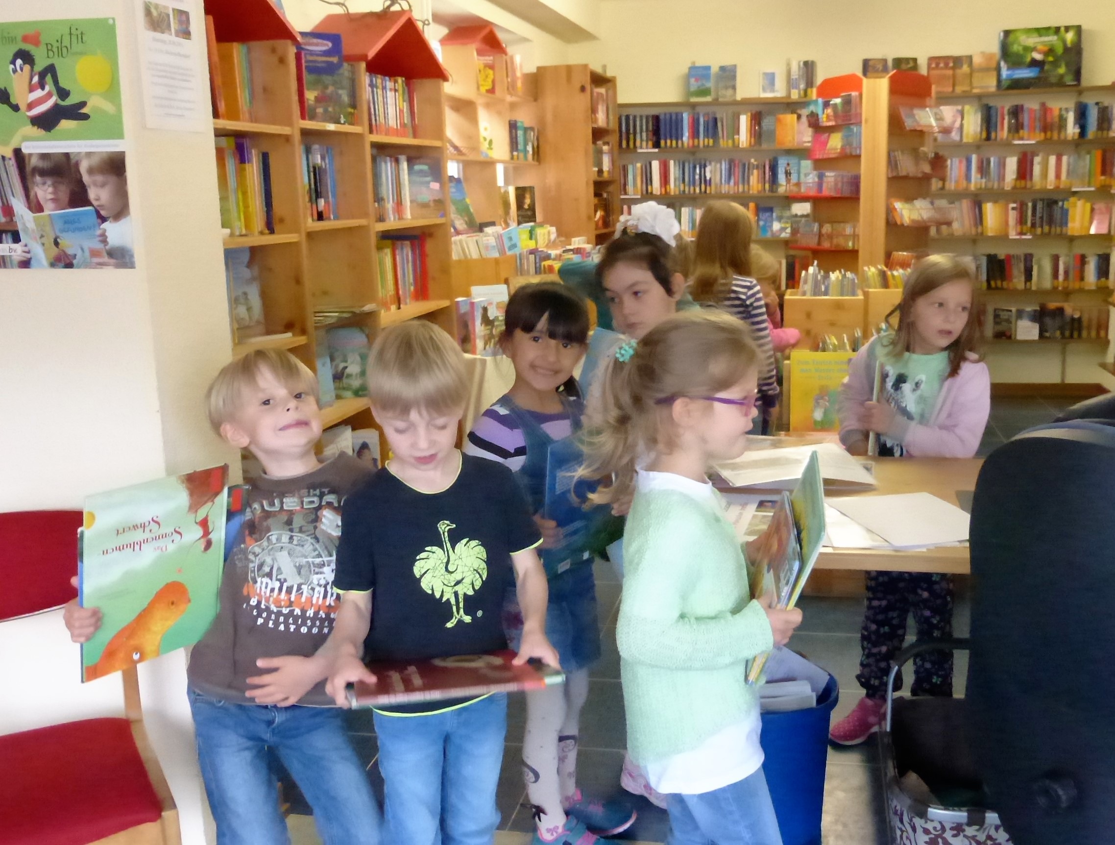 11 Kinder aus dem Kindergarten „Unterm Regenbogen“ Oberndorf wurden in der Bücherei Oberndorf „Bibliotheksfit“ (Bibi) gemacht. Unter der Leitung von Jutta Röder und Renate Bien flogen sie ins Bücherland und erfuhren, was passiert, wenn das Huhn in der Schweinekuhle liegt und der Hase versucht Milch zu geben. Denn darum ging es im Buch „Was macht das Schwein auf dem Ei? – Ein verrückter Tauschtag“.